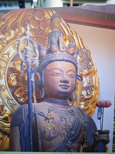 In the Kannon Hall, there is a single-block wooden statue of the Eleven-Faced Kannon, said to be the work of Jikaku Daishi Ennin. This statue is flanked by Uho Doji and Kasuga Ryujin, making it the 30th temple of the Rakuyo 33 Kannon Pilgrimage.